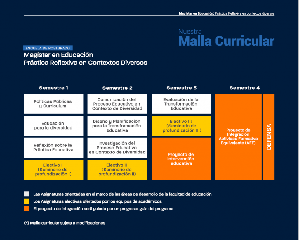 El Plan de Estudio del Programa de “Magíster en Educación: la práctica educativa en contextos diversos” tiene una duración de cuatro semestres académicos y trabajo tutelado destinado al desarrollo de trabajos específicos. Constituidos por tres áreas de especialización: “Didáctica, inclusión e innovación”; “Formación docente y desarrollo profesional del profesorado” y “Educación, política y ciudadanía” que reúnen un conjunto de asignaturas fundamentales y complementarias electivas a la formación, y un trabajo final para la obtención del grado. Durante todo el proceso formativo se debe desarrollar las distintas etapas del proyecto de integración, el cual tributa al trabajo final de graduación, el que será guiado por un profesor(a) patrocinante.