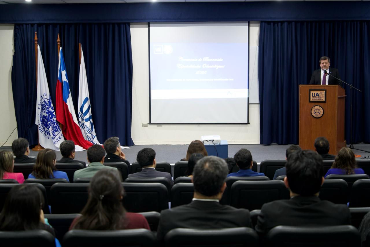 Para dar inicio a la actividad, el decano Bravo se dirigió a los y las estudiantes, y destacó el papel clave que cumplen los programas de especialización en el desarrollo de la universidad y la región, recordando que la Universidad de Antofagasta es actualmente la única institución de la macrozona norte que imparte programas odontológicos de este nivel.