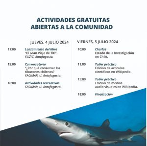 A las 15:00 horas de este jueves, se tiene contemplado el Conversatorio “Por qué Conservar los Tiburones?, que se llevará a cabo en las dependencias de FACIMAR en el Campus Coloso de la Universidad de Antofagasta, mientras que a las 16:00 horas la jornada finalizará con actividades recreativas en el mismo Campus de esta Casa de Estudios Superiores.